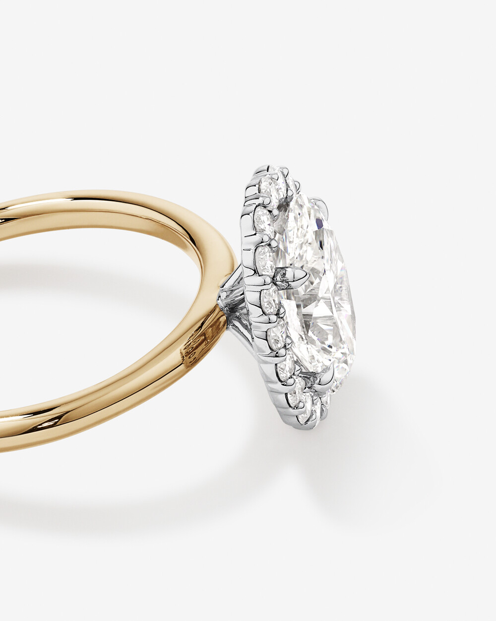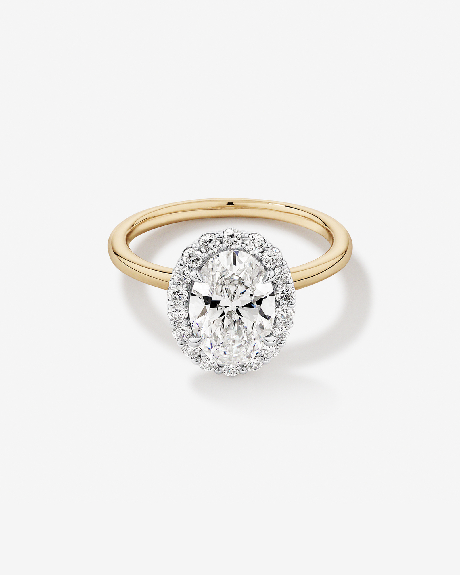 Begin your forever with this 14 karat yellow and white gold oval halo engagement ring, blending elegance and modernity. It features a captivating 2.00 carat oval cut lab-grown diamond at its heart. Encircled by a halo of round brilliant laboratory-grown diamonds, the total carat weight is 2.34.